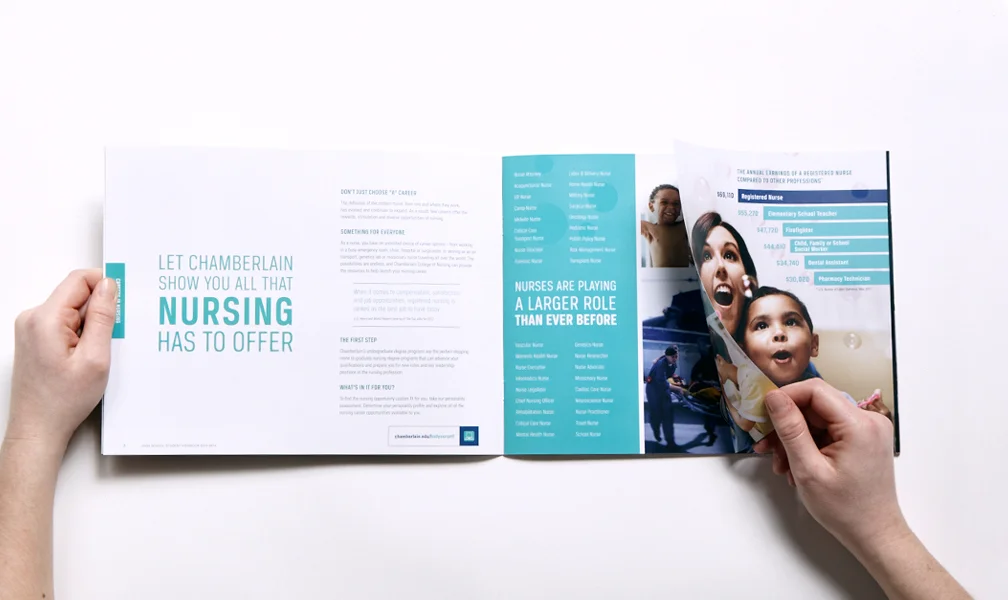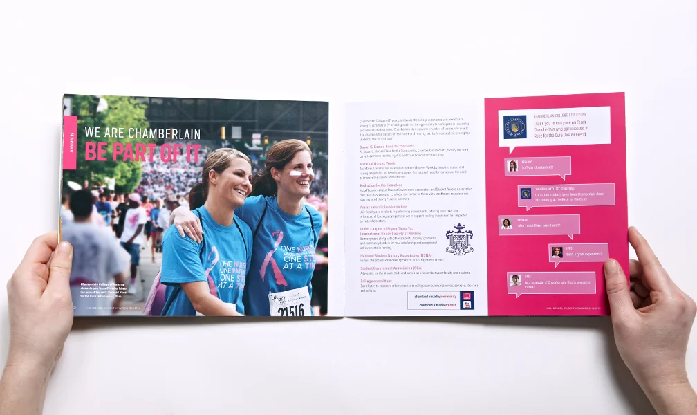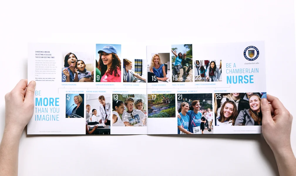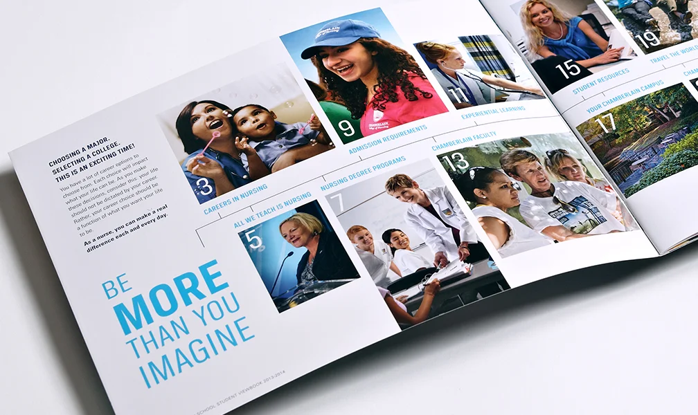 At Prariefire Communications, I took the lead on designing, laying out, and periodically updating Chamberlain College of Nursing’s Chamberlain Magazine, undergrad and graduate academic catalogs, and annual academic view book. Here is a peak at some of my favorite spreads from those publications.